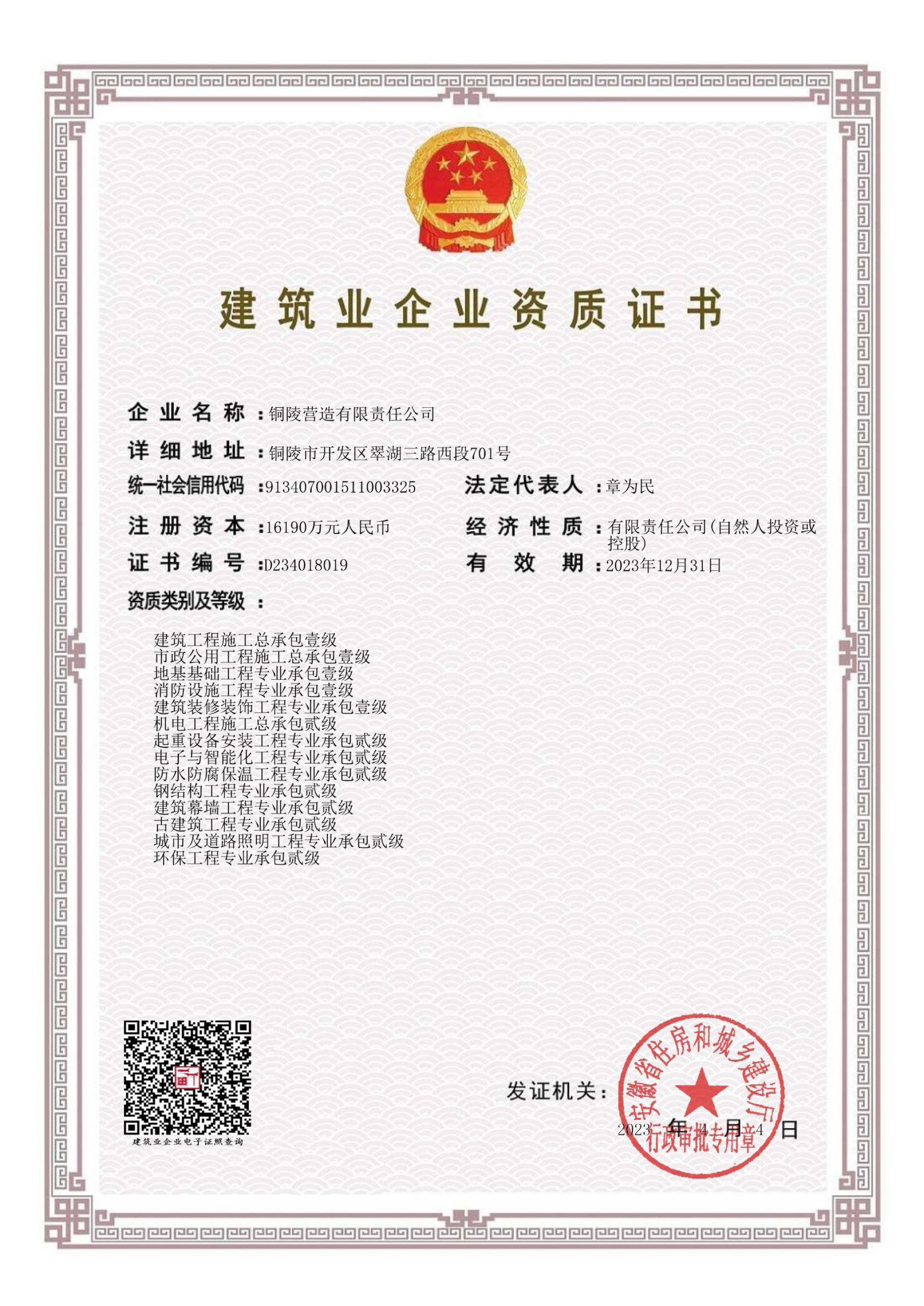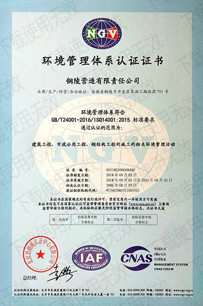 銅陵營造有限責任公司是國家住建部核準的房屋建筑總承包一級企業。2006年7月,企業二次改制為民營企業,并更名為“銅陵營造有限責任公司”。目前,公司擁有房建施工總承包、市政公用工程總承包、鋼結構專業工程承包、建筑裝修裝飾專業工程承包四項壹級資質,機電安裝、起重設備安裝、建筑幕墻三項貳級資質,地基與基礎一項叁級資質。2008年通過北京恩格威ISO9001、ISO14001和OHSAS18001“三合一”體系認證。